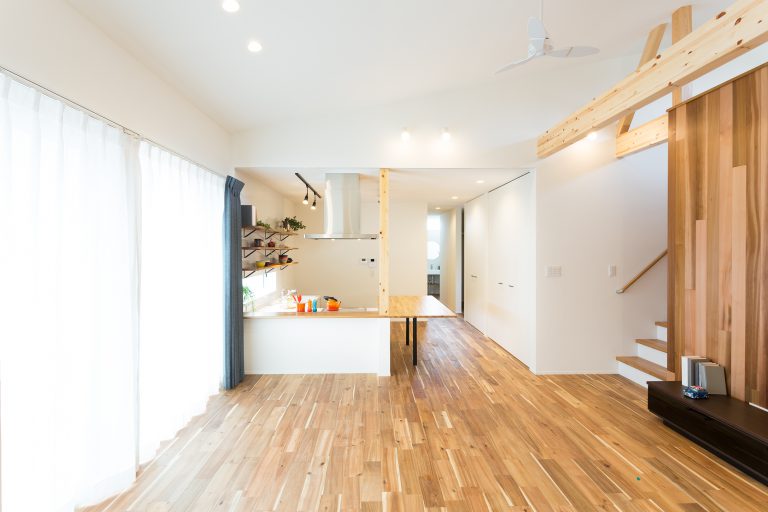 シンプルに見えて細部にまでこだわった平屋。 まず目に入るのは広々としたウッドデッキ。 ウッドデッキ下も収納スペースとして活躍します。 保管しにくいアウトドアセットはここに忍ばせておいてもよさそうです。 軒が長く、玄関ポーチの天井まで板張りが続くデザイン。 軒と板張りの効果で、実際よりも奥行きがあるように感じます。 玄関ポーチを広く設けられない方にとてもおすすめです! 軒は外観に深みを出してくれるだけでなく、雨の日でも安心して荷物の搬入ができるという利便性もあります。 また、軒がない家に比べて、外壁の劣化スピードを緩めてくれるのです。 それでは、家の中はどうなっているでしょうか。 玄関にはウォークスルークローゼット。家族用の動線と来客用の動線がはっきり分かれているので、 急な訪問でもすっきりとした空間を保てます。 ハンガーパイプも設置しているので、コートや鞄などの保管場所にも便利です! 家の中心にはL字の造作カウンターとキッチンが設置されています。 キッチンを一段低くすることで造作カウンターと同じ目線の高さになり、家族の会話もより弾むでしょう♪ それだけではありません。キッチンの小窓からは庭で遊ぶお子様の様子もそっと見守ることができます。 小窓もキッチンに合わせ少し低い位置に設置しているので、 庭にいるお子様の様子は確認でき、向かいの方との目線はずらしてくれるという建築家のアイデアです。 他にも坪数に対して、広々と感じられる工夫があります。 一つ目が玄関からドアの仕切りがないこと。二つ目が勾配天井を利用した、リビングの天井の高さです。 玄関から奥の部屋まで一体にすることで、広さを感じるのびやかな空間になります。 そしてリビングの天井に勾配をつけ、開放感をプラスした居心地のよい住まいを実現しました。 あえてリビングだけを勾配天井にすることで、キッチンスペースとの差が生まれ、よりリビングの開放感を味わえる仕組みです。 ひとつにつながったマイホーム。それは、家族が心でつながっていることを間取りで表しているのではないでしょうか。